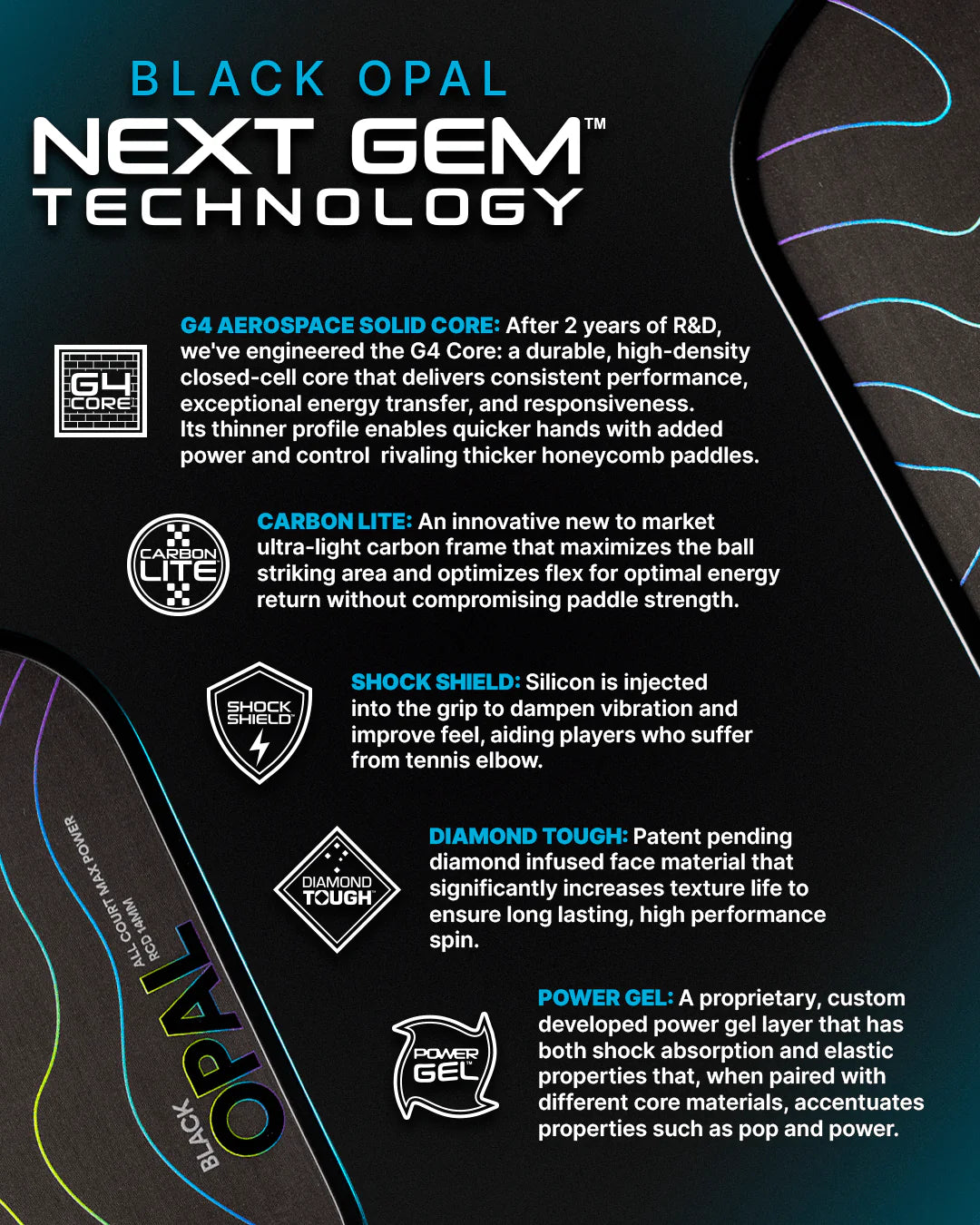 We set out to create a paddle that redefines what’s possible in power, control, and durability. The Black Opal is a rare gem in the pickleball world, built from the ground up with next-generation materials and patent-pending technologies that deliver unmatched feel and performance for players at every level.