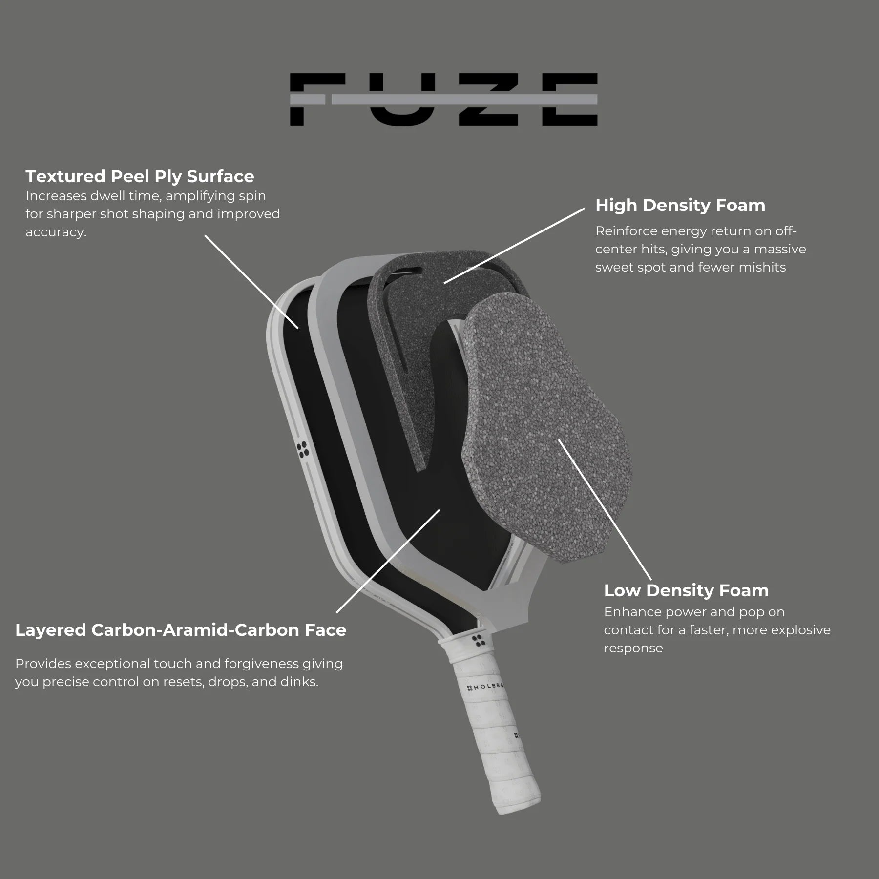 The Fuze unlocks a new level of performance. Powered by Holbrook’s patent-pending Dual Density Foam Core, it delivers explosive power while maintaining elite forgiveness and control. The result is a remarkably consistent feel across the entire face—even on off-center contact. Translation: miss the sweet spot… and still hit the shot you want.